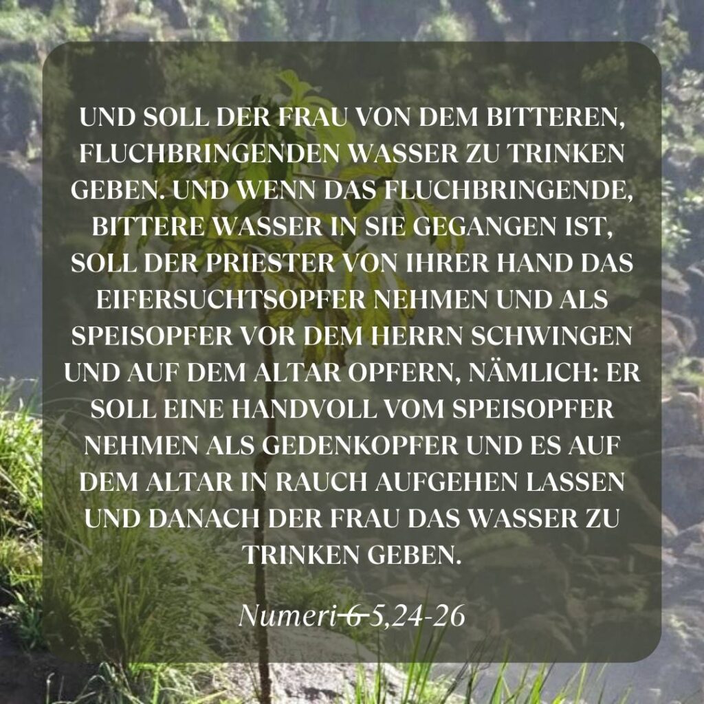Im Text in Kapitel 6 ist der aaronitische Segen zu finden. In vielen Gemeinden wird er jeden Sonntag gesprochen. Dieselben Verse ein Kapitel vorher habe ich noch nie in einem Gottesdienst gehört: Hier geht es um eine Art Ritual, durch das herausgefunden werden soll, ob eine Frau ihrem Mann untreu gewesen ist. Man könnte sogar argumentieren, dass eine Art Abtreibung passieren würde, wenn sie wirklich fremdgegangen ist.